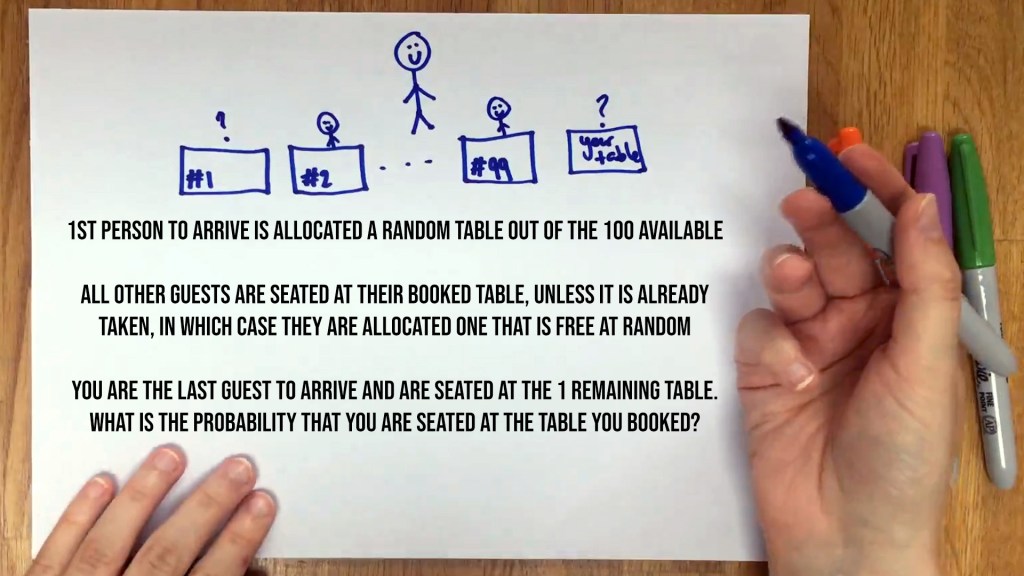 […] intern Amie explains the solution to the COVID-19 seat reservation puzzle. If the first guest to arrive at a restaurant with 100 tables is seated randomly, and all others […]