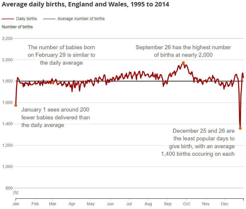 Now, given the tone of the article so far, it may not surprise you to learn that this paradox is not entirely true. When creating a model of the situation, we assume that the same number of babies are born every day of the year. This is not the case. When we look at data from the Office for National Statistics we can see that even though this assumption is true for most days, there are days with substantial differences. For example, more babies are born in September and October than in the other 10 months of the year, and less babies are born on 25th and 26th December and 1st January (maybe they don’t want to interrupt their parents’ festivities?).