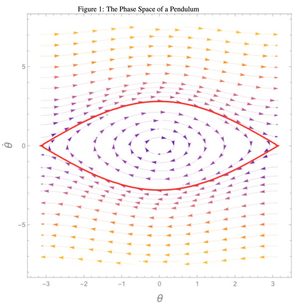 Figure 1 is a vector field, so each point in the θ, dθ/dt plane is assigned a vector, of which a finite number is represented as arrows. A given starting point on the plot (representing the pendulum’s initial conditions) will be transformed by the magnitude (ranging from yellow (low) to blue (high)) and directionality of the vector on which it lies, and this process will continue continually, resulting in smooth motion. It is clear that starting points within the bold red line (the “separatrix”) will spiral inwards until reaching the centre of the plot (in physical terms, the pendulum will gradually lose energy until angular position is 0 (it hangs perpendicular to its support) and angular velocity is 0 (it is stationary)). Starting points outside the separatrix represent initial states which cause the pendulum to swing in a circular motion around its support, but even these will eventually be “attracted” into a spiral similar to that displayed around the origin. We call the points to which all inputs tend “fixed point attractors”.