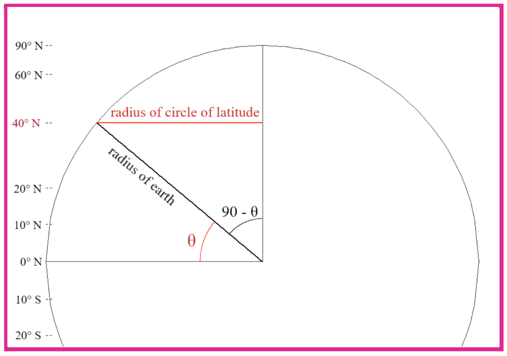 In this diagram, the circle is a cross section of the earth along its axis, so its radius is the earth’s radius. The angle marked θ is the latitude, which then creates a right angle triangle from which we can work out the radius of the circle at that latitude.
