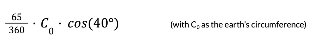 Knowing that the change in longitude across this journey is about 65 degrees, we can calculate the length of the arc, as the following:
