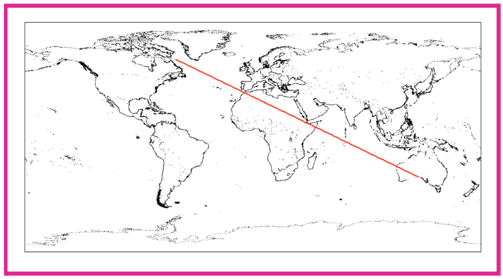 This map shows a bearing of 115° from north, going from just off the coast of Canada, to Australia.