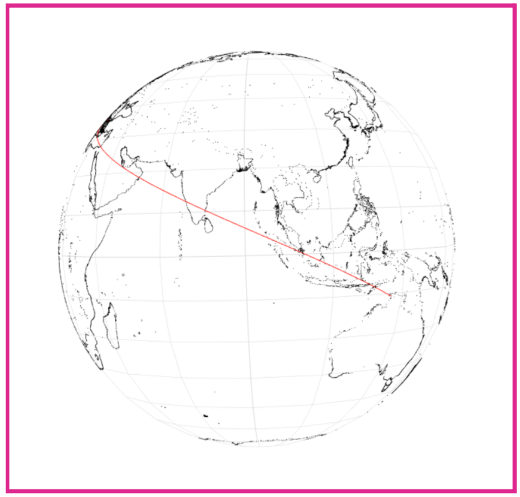 It’s natural to think of this journey as a straight line, as that’s how we perceive it travelling along and how it might appear on some maps. But considering that the earth is a sphere, the course looks more like this: