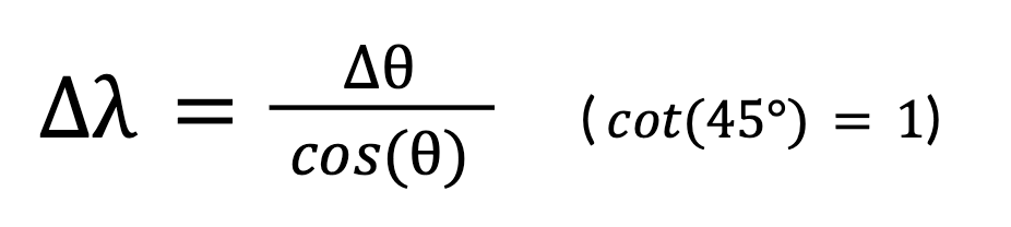 The issue here is the cos(θ) term as there is no single latitude to measure this at. Therefore the exact solution requires integrating 1/cos(t) with t across the latitude range. But we can still approximate an answer, which is especially accurate at low latitudes.
