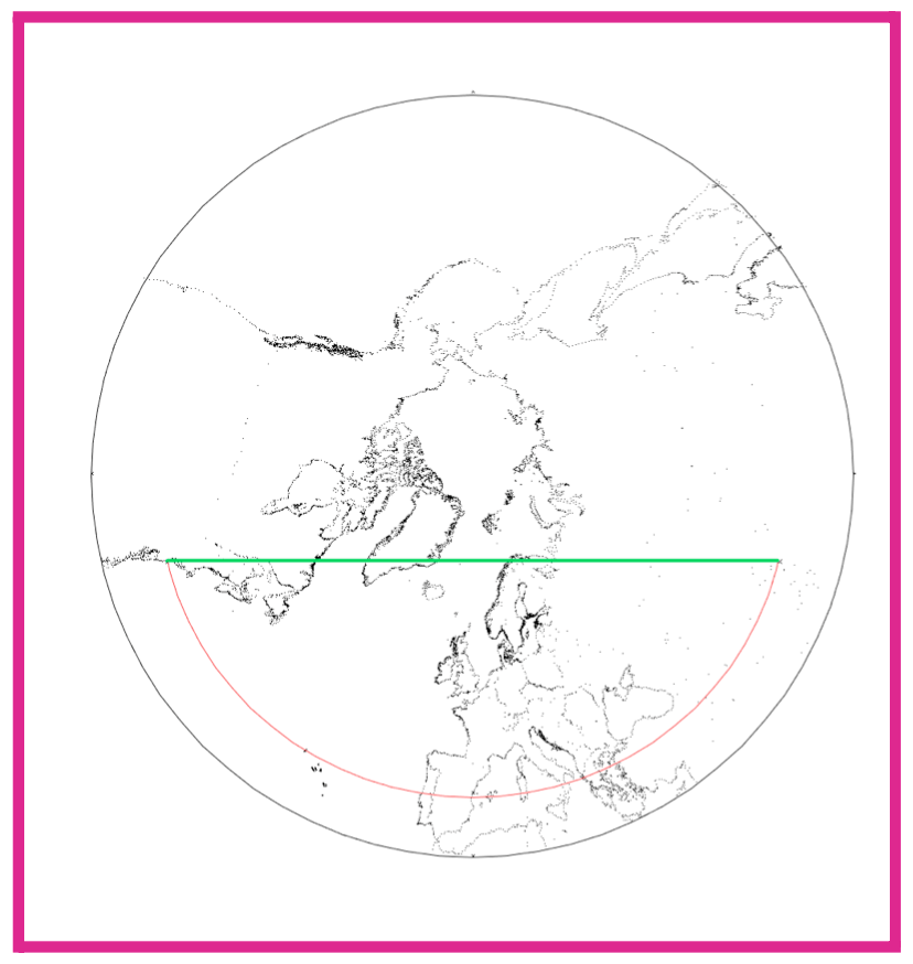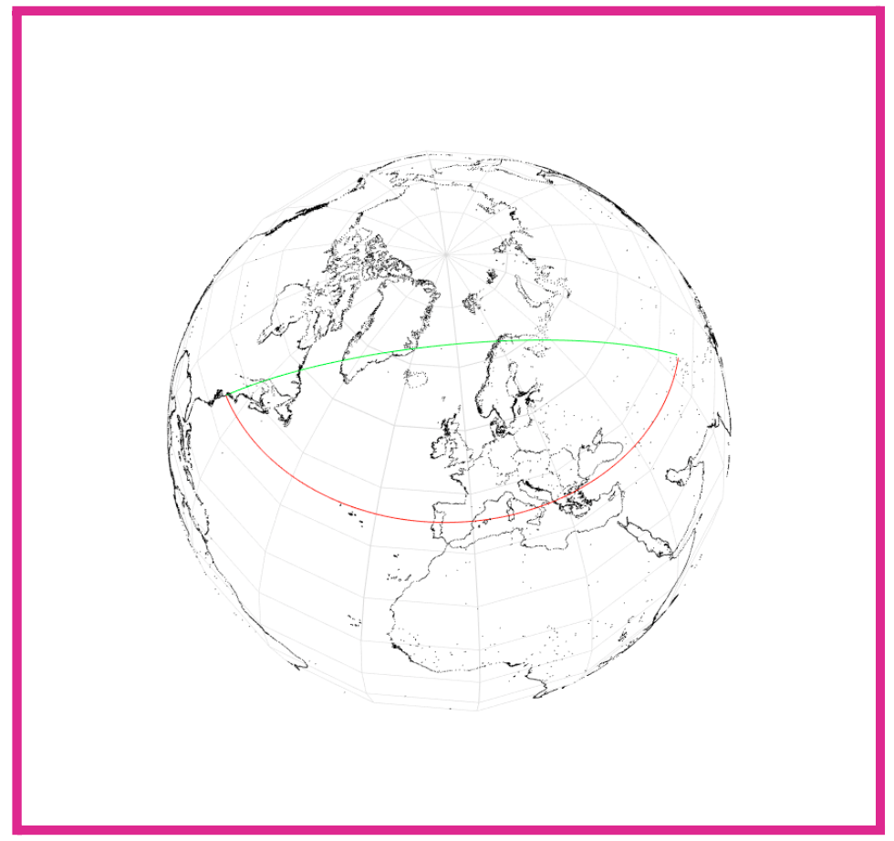 But one of the first ever map projections, the ‘gnomonic’ projection developed by the Greek mathematician Thales over 2500 years ago, does preserve great circles as straight lines. A gnomonic projection centred on the north pole can illustrate how great circles are efficient paths.