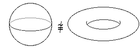 When two shapes are homeomorphic, they are topologically invariant. A topological invariant is essentially just a topological property preserved when we deform and stretch a shape. An example would be the number of holes (number of closed intersecting curves) in an object. Topology allows us to stretch, twist, lengthen, smoothen objects but we are not allowed to tear or punch holes. Since there is no way we can transform a sphere into a torus (a single holed geometric object) without punching a hole in the sphere we can conclude a sphere and a torus are not topologically equivalent (not homeomorphic). This symbol ≅ is used to show 2 shapes which are homeomorphic to each other and the symbol ≇ shows 2 topologically inequivalent shape. For example: