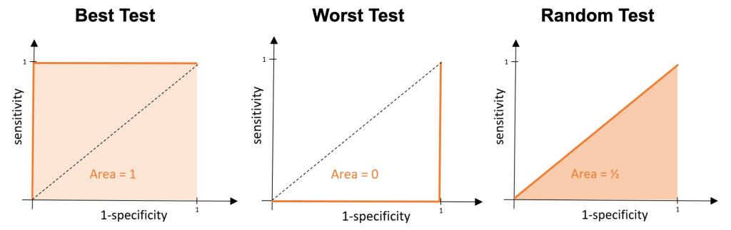 If we think back to our perfect test, we would have an area under the curve of 1 – this is the maximum AUC value. Our worst possible test would have an area of zero – the minimum AUC value. For our random test the area would be ½.