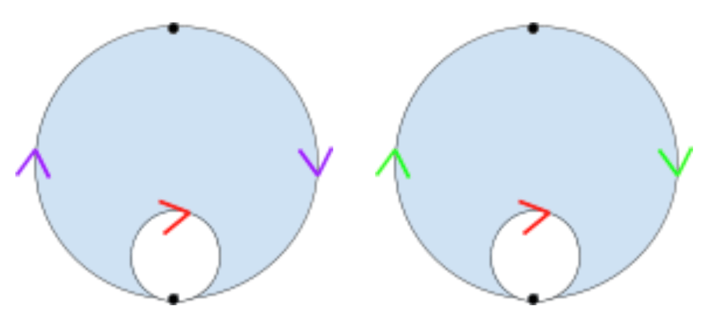 We can unfurl these circles at the bottom dot to get two triangles. We get triangles, as each of our cut ‘circles’ have 3 ‘sides’, the two ‘sides’ on the outside (purple/green arrows with the dot representing a corner), and the ‘side’ given by the inner circle we have cut out (the red arrow).
