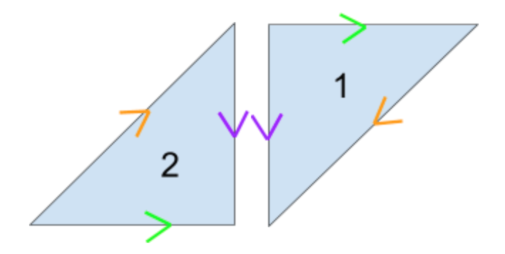 Now we’re going to split our diagram into 2 different triangles along a new line, shown with the orange arrow below. It’s important to realise that we are not cutting the surface, as the sides of the line will still be connected (represented by the arrow along them), we are just changing how we are representing our surface.