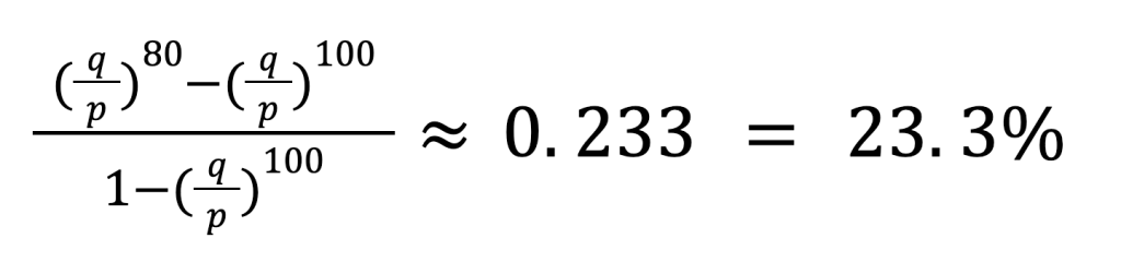 Here q = 50.1, and hence q/p ≈ 1.004. Let’s see how turning £80 into £100 might go, using the second formula we derived. The chances of failure are: