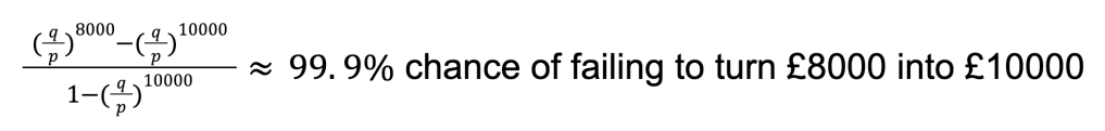Suppose that Joe, by sheer luck, finds a game in Las Vegas that allows him to apply this betting system and is actually unbiased: no house edge, no tricks from the dealer, a genuine 50% win probability. Turning £80 into £100 here seems like an easy feat; if we look back at the bankruptcy probability we computed, the odds of him failing are 1 – 80/100 = 1/5 = 20%, meaning that he has an 80% chance of winning. Even better, he has the exact same odds of turning £800 into £1000, or even £8000 into £10000. This is due to the special property of direct proportionality that this much simpler case provides, but mostly thanks to Joe’s safe betting habit of trying to gain only a healthy fraction of his original wealth. Suppose, however, that he gets greedy, drunk on his past success, and decides to quadruple his wealth in one go. Turning £25 into £100 (or £100 into £400, or £50k into £200k and so on) would have a 1-25/100 = 1 – 100/400 = 1 – 1/4 = 75% chance of failure. Joe taking a riskier approach by aiming for a much larger gain in relation to his initial bankroll may well be his undoing.