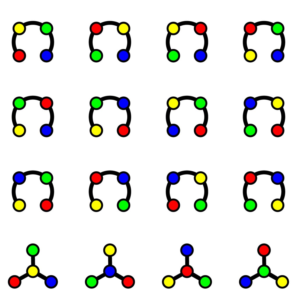 Now, what if you have 3 vertices – 1 red, 1 blue and 1 green – how many ways can you join these all together?
