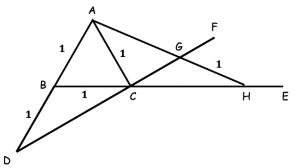 All done? The last challenge is coming! Place the ruler so it goes through point A and adjust its direction to make one end of the marked length fall on line CF and another end on line CE. In other words, the distance along the ruler between the lines CF and CE should be the ‘unit length’ (if you’re still unsure see the diagram below). Thus, the intersection points form a line GH with the given unit length. Then, the length of line AG (shown in the diagram below) is exactly what we want: 21/3 times the given length.