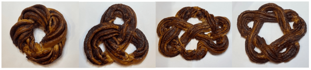 When studying knots, it is important to have lots of pictures to help visualise what is going on. However, pieces of string are boring! We have instead chosen a slightly tastier representation of a knot: homemade chocolate babka. Babka is a traditional Jewish bread, which is rolled into a rope with layers of chocolate and shaped into various patterns. While most Jewish bakeries don’t tend to sell mathematical knots, we can learn a lot just by looking carefully at them.