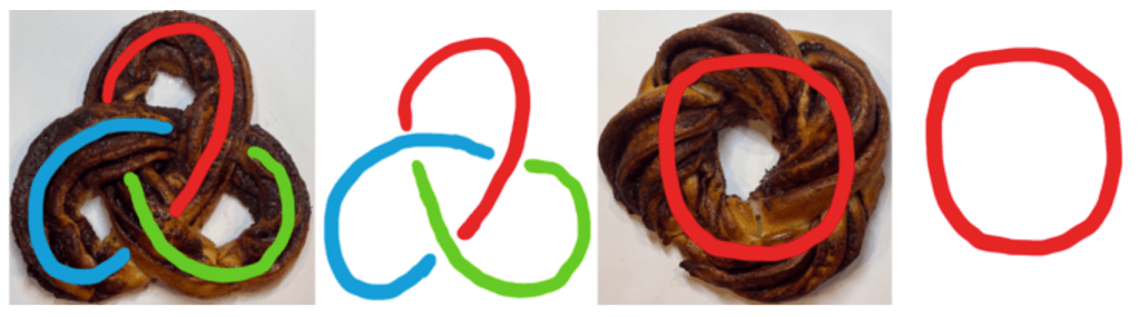 We now have two invariants which differentiate between the trefoil and the unknot: tricolourability and crossing numbers. So, if we are given a trefoil knot diagram, we can recognize that it is not the unknot. What if we generalised this idea? If we are given any knot diagram, is it possible to determine whether it is simply the unknot? We can see how tricky this could be by looking at Haken’s unknot (we promise we did create a babka version, however unfortunately the oven was too small to bake it). It looks incredibly complicated, but it is just an unknot with a huge number of Reidemeister moves.