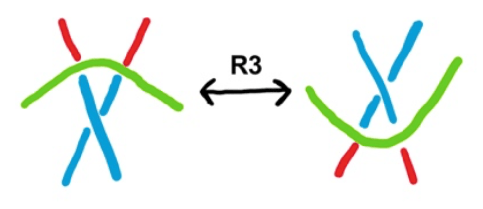 There are 3 types of Reidemeister moves, which we will refer to as R1, R2 and R3. All of these are easy to visualise.