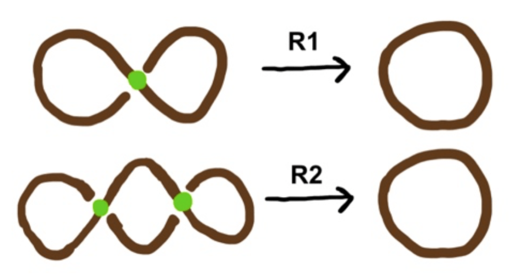 Let’s first take a closer look at knot diagrams with a crossing number of 1 and 2. When we draw a knot with a single crossing point, we see that this is simply the unknot with an R1 twist. Likewise, when we draw a knot with two crossing points, this is the unknot with an R2 move.