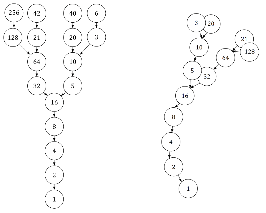 Another graph which is suitable for the representation of the Collatz conjecture is a directed graph. A directed graph is made up of vertices and arcs, which show the relationship between different quantities. The Collatz conjecture makes an assumption that all of the flight numbers transform into one, which means that in a directed graph they originate from the number 1. This constructs a graph which resembles the flow of several tributaries into a river. Altering the directed graph by rotating the vertices clockwise if the number is even and anti-clockwise if the number is odd produces a fascinating model.