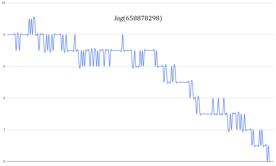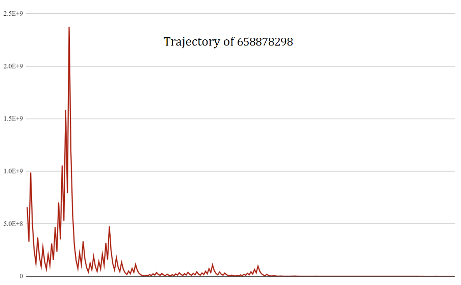 Consider the random nine figure integer 658878298. Large numbers are effective in revealing patterns as they have many altitudes to show them distinctly on a graph. The trajectory of the number is standard, it reaches 1 after a while but the difference between the peak altitude and 1 is so great that the approach to 1 is concealed at this scale.