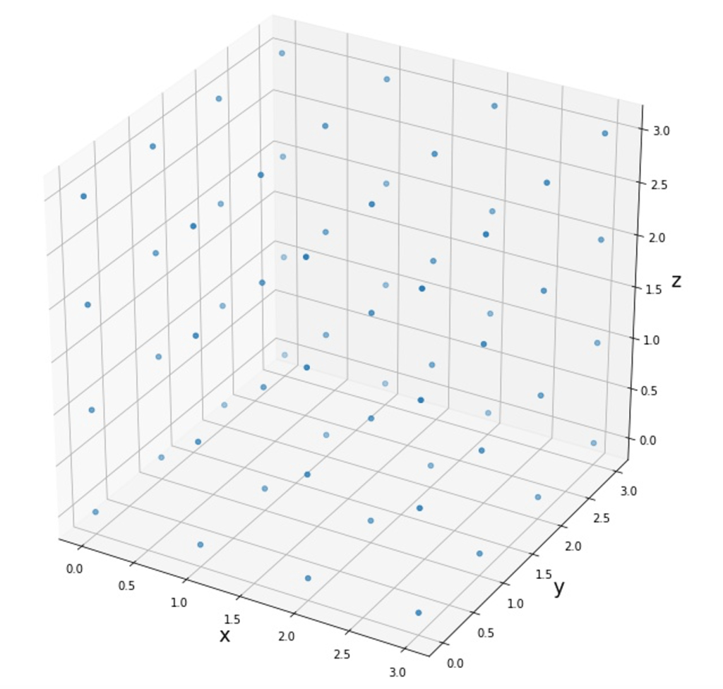 From a mathematical point of view, space is continuous, it is made up of an infinite number of points. A computer cannot take them all into account, so we consider only some of them. At these locations we will evaluate through a numerical approximation (refer to the second article of the series for an example of how this is done) the value of the solution to the equation. The picture below shows what this means graphically.