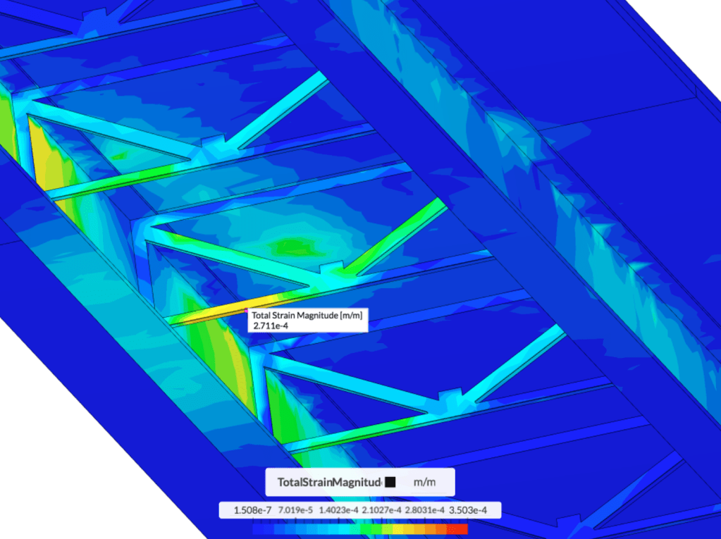 To conclude on the engineristic note, the image below shows a FEA simulation of a bridge traversed by a car. The bright colours in the diagram denote the areas where stronger forces are applied by the presence of the load and the bridge’s structure. You can play with the simulation for yourself here.