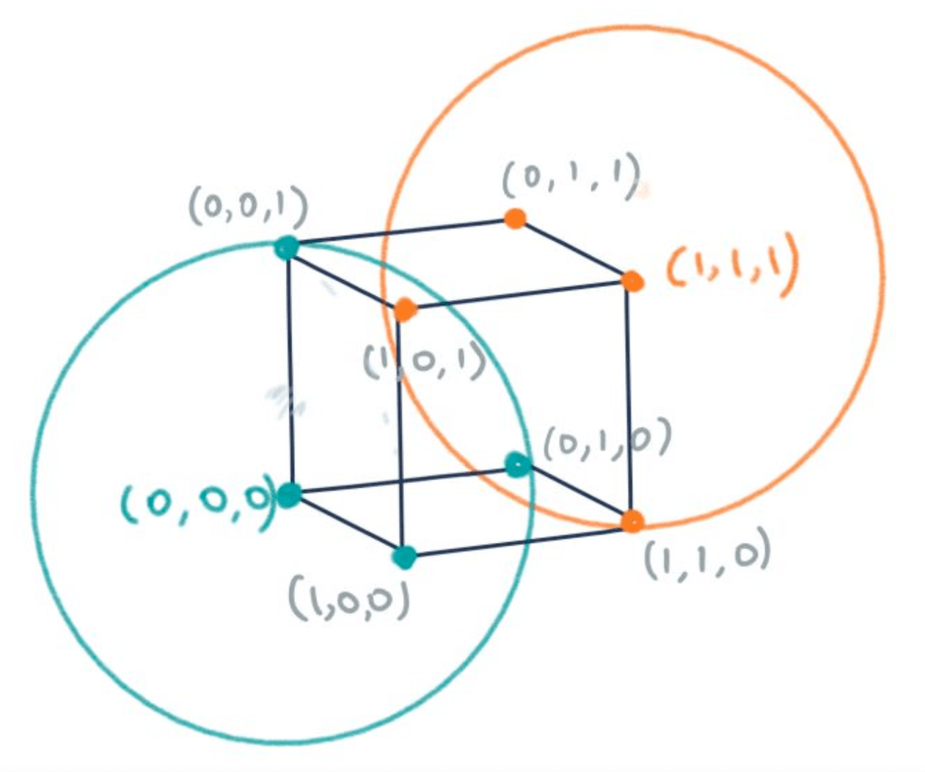 There is a link with geometry here – this is where sphere packing comes in. Sphere packing concerns the arranging of non-overlapping spheres within a space, where we are trying to maximise the total volume of all the spheres that fit within this space. If we consider (0,0,0) and (1,1,1) as points in a 3D space, then all our other possible messages, where only one error has occurred, can also be visualised as vertices of a cube. Two spheres of radius 1 can then be centred at (0,0,0) and (1,1,1). The vertices contained within the sphere can then be interpreted as codewords for the point at the centre of the sphere.