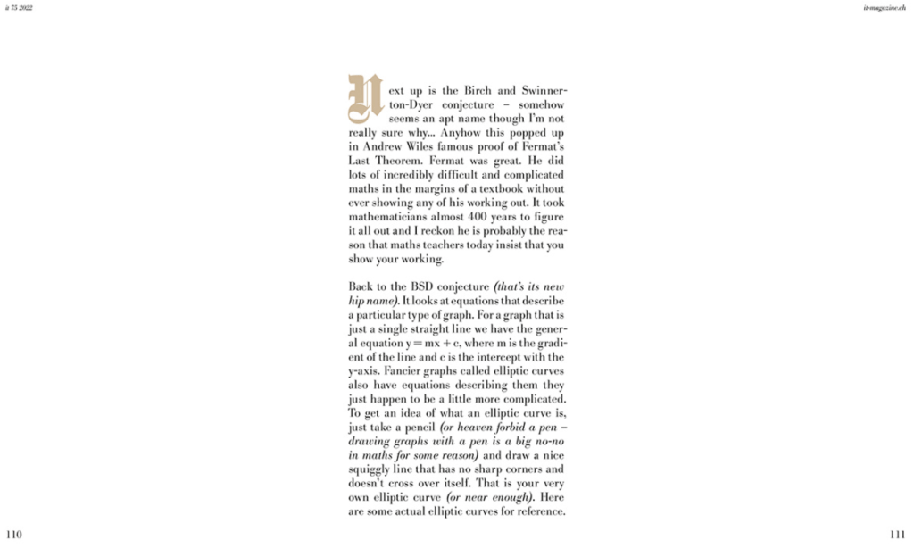 Tom’s article on the Birch and Swinnerton-Dyer Conjecture has been repurposed as part of ‘it magazine’ – an art and fashion magazine from Zurich known for its independent reporting and aesthetics. The editor is Carlos de Arellano.