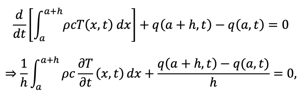 (Note that we are integrating over depth, not over time!) The net heat flux into this interval equals q(a,t) – q(a+h,t) (as we want the downward heat flux at x = a and the upward heat flux at x = a+h).