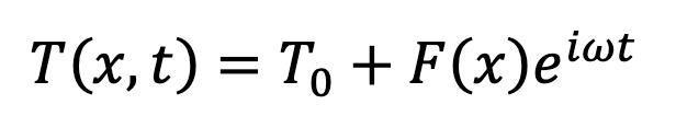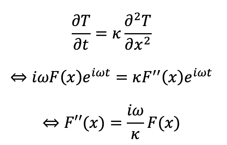 Now, you may be asking when is such a candidate solution compatible with the heat equation? Well, this solution is separable apart from the additive constant. This means that the term F(x)eiωt is the product of a function of x with a function of t. Therefore, it is easy to compute the partial derivatives (remember that to do so, we pretend that the other variable is a constant):