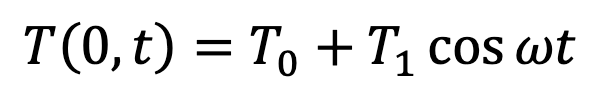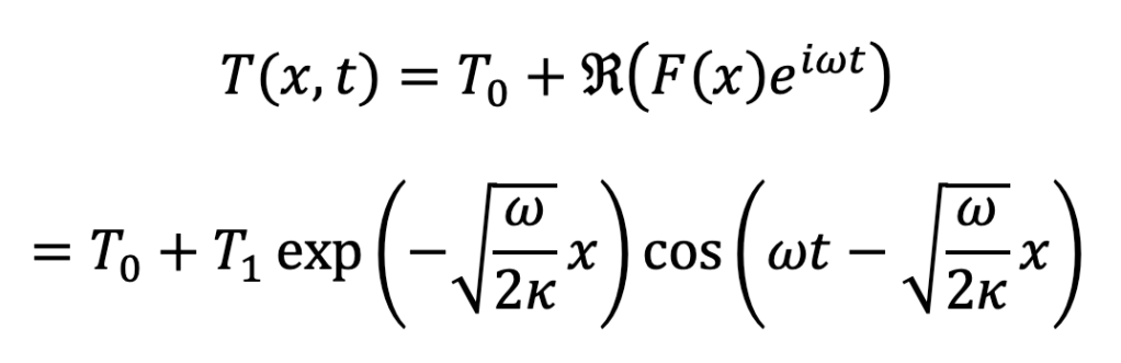 The temperature variation across the year is primarily controlled by the seasons. We thus expect a periodic solution for the heat equation, as the seasonal cycle repeats: it can be approximated by sine-wave temperature variations. As the seasons don’t depend on depth, the variables depth and time should appear separately.