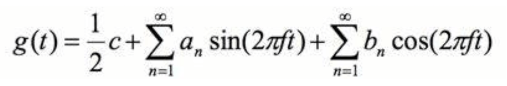 To simplify, the an and bn refer to a list of values that are used as coefficients for a particular frequency of sine and cosine respectively (note a value of 0 means that this particular frequency does not exist in the function g(t). Next all these values are summed up by the use of the capital sigma and then a constant (c) is added. In simple terms we are adding infinitely many sine and cosine functions together!