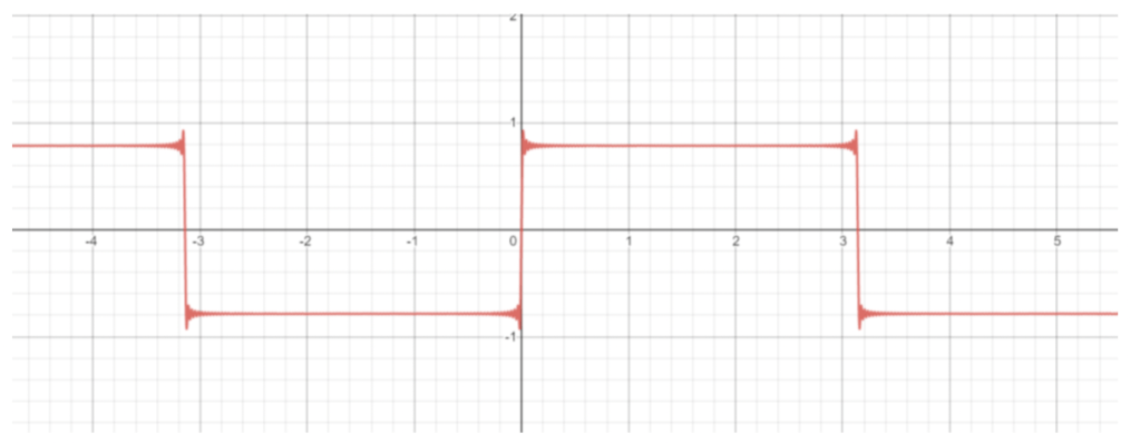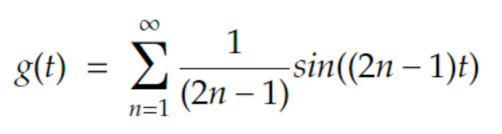 Not impressed? It has been proven this series converges to what is known as a square wave. Square waves are normally found only in the most digital applications, in your computers and electrical timers as they apply well to binary as they are either high or low. What is so outstanding about this is that we have taken something so pure as a sine wave, something so inherently physical that it can model the smallest vibrations of particles to the gravitational waves that spread out through the galaxy, and infinitely add them we can converge on something so discrete and digital.