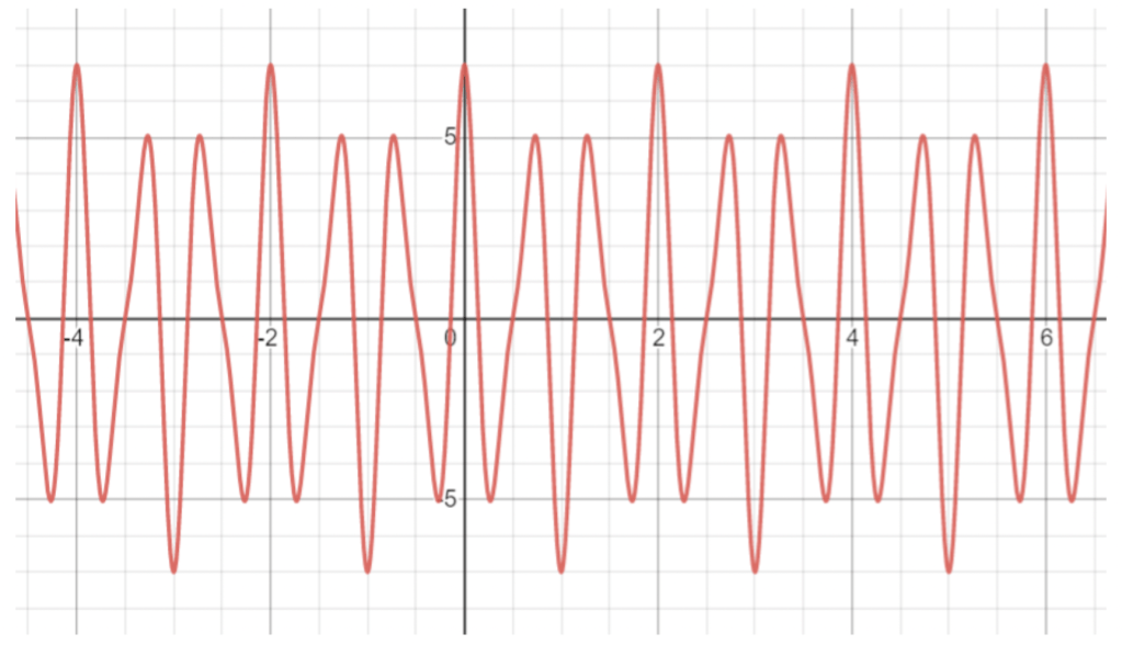 This may look extremely daunting at first and some of the maths to explain this is difficult but there is a logical way of understanding this transformation. One the most basic level we have a function and we plot it as normal. Let f(x) = 5 cos(3πx) + 2 cos(5πx). I hope from here it is easy to see that if we break f(x) down into its underlying frequencies we have one cosine function of ‘3’ and another of ‘5’ with the respective amplitudes being ‘5’ and ‘2’. With the Fourier transform we get F(x) which displays this frequency and amplitude information. The function f(x) has been plotted in red below:
