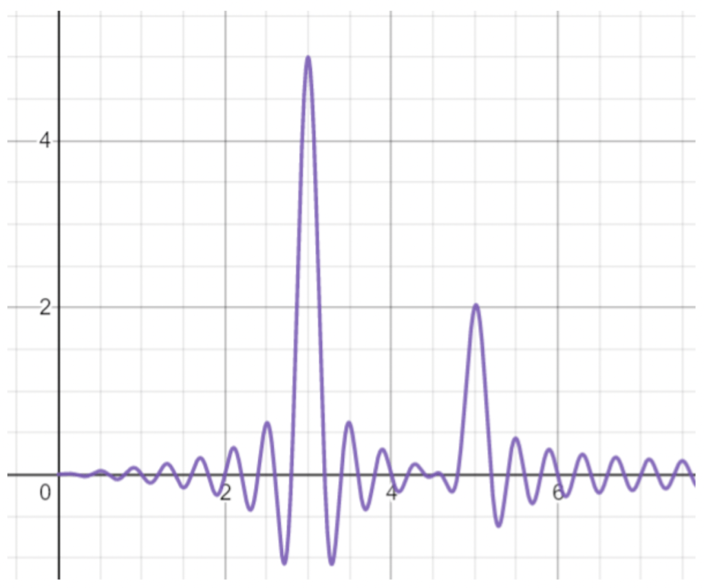 We can see that the large spikes in the transformed function have maximums at (3,5) and (5,2) which, due to the x-axis being representative of increasing frequency and y-axis being amplitude, we see that this perfectly represents our original function f(x) in terms of frequency and amplitude. Or, to be more specific, transforms f(x) from the frequency domain to the frequency and amplitude domain.