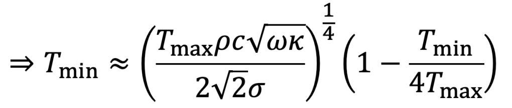 To find the minimum surface temperature, we do the same thing at midnight. Now the Sun is not contributing, because it’s night! So we get that the heat flux conducted into the surface exactly compensates that radiated into space. That is: