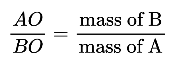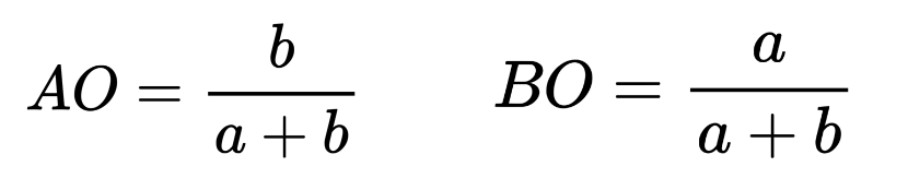 For example, if both A and B have the mass 1 (a = b = 1), then O is at the midpoint of AB (AO = BO), as shown in Figure 5 below. If a = 1 and b = 2, then AO/BO = 2 and AO = 2/3, BO = 1/3. We can think of the line segment AB as a scale or a seesaw. In order to balance the scale, we want to put a heavier weight closer to the centre, and a lighter weight farther from the centre.