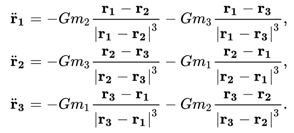 The 3-body problem describes a situation in physics that involves taking the initial momentum of 3 bodies, and according to Newton’s laws of motion and law of gravitation, attempting to solve some equations for their subsequent motion. At first this may seem like an easy enough problem, as we can write down all the equations very simply as: