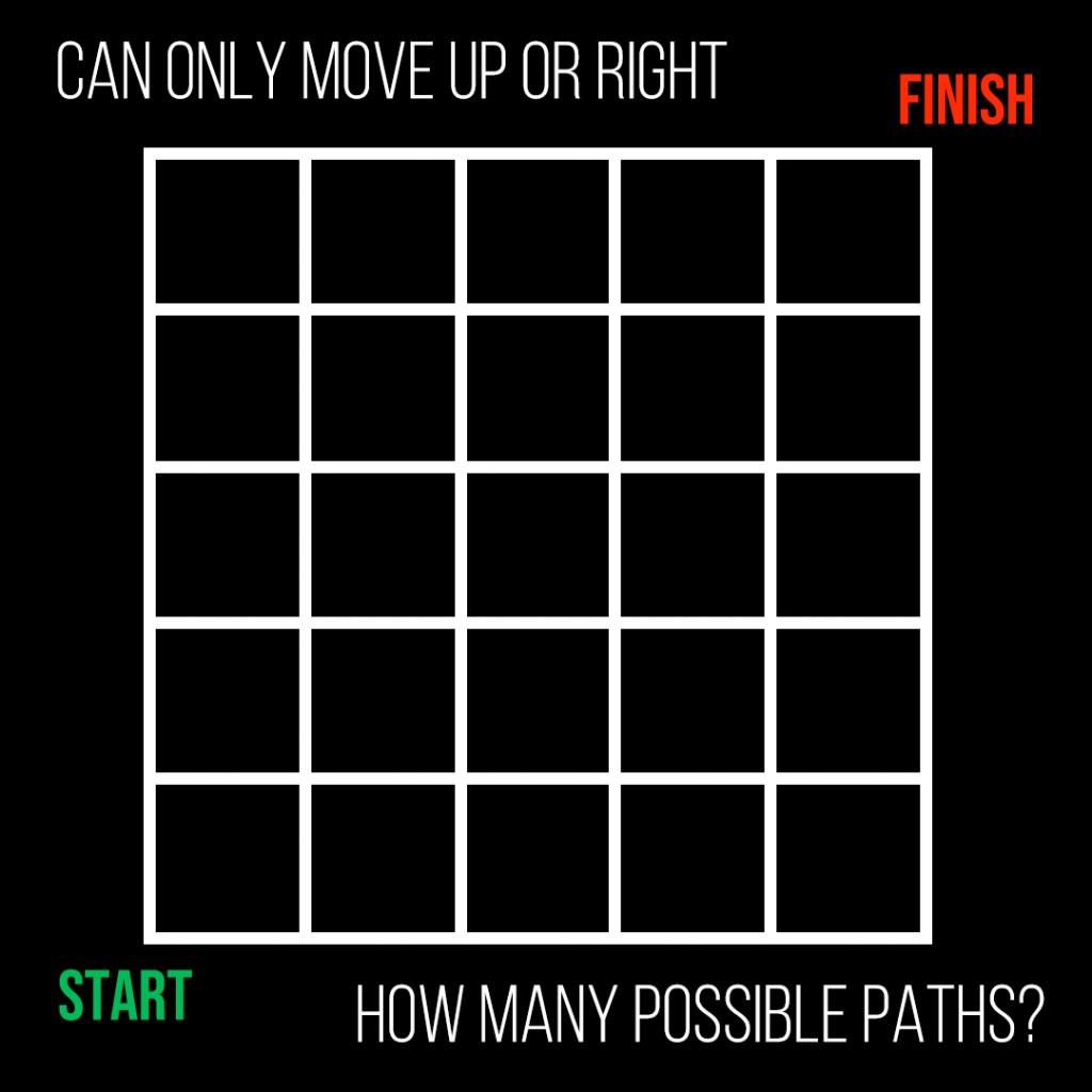 To move from the ‘start’ to the ‘finish’ you need to take 5 horizontal steps and 5 vertical steps in any order. Since the direction of each is fixed (ie. right and up) the only choice you have is whether to move horizontally or vertically each time. Given the total number of steps will be 10 – regardless of the path you choose – and there must be 5 of each type, once you have decided at which steps to move horizontally (for example), the others are all fixed. Therefore, you have to decide where to place the 5 horizontal steps out of a possible choice of 10 locations. Each such combination will give rise to a different path, so the final answer is 10 choose 5 – exactly how we define the number of ways to place 5 objects in 10 possible positions.