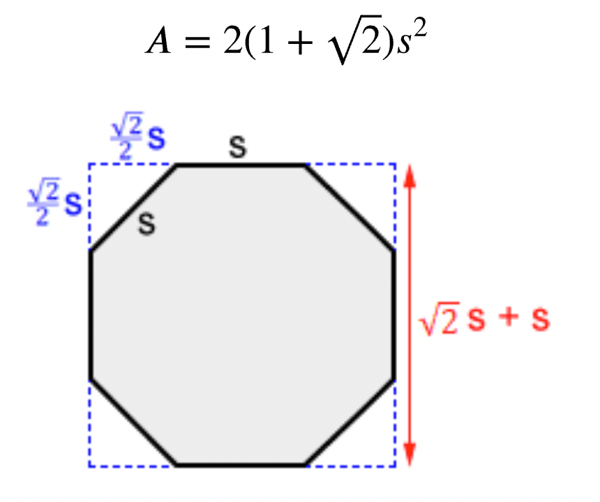 The formula for the area of a regular octagon is 2*(1 + sqrt(2))*s2 where a is the length of each of the 8 sides of the octagon. However, since we do not know s initially, we may use the following diagram: