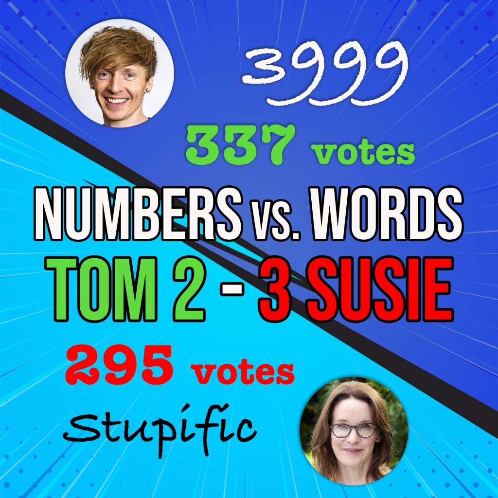 […] Numbers vs. Words Round 1: 29 vs. “to lick something into shape”Numbers vs. Words Round 2: Binfluencer vs. 3435Numbers vs. Words Round 3: 6 vs. WentNumbers vs. Words Round 4: 31,557,600 vs. MountweazelNumbers vs. Words Round 5: 3999 vs. Stupific […]